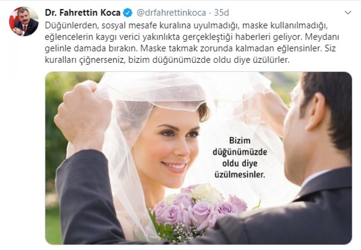 Sağlık bakanı fahrettin koca twitter'dan düğünlerdeki koronavirüsle mücadele kapsamında sosyal mesafe kurallarına uyulmaması. Sağlık bakanı fahrettin koca'dan düğün, nişan, kına açıklaması (2 eylül 2020). Sağlık bakanı fahrettin koca twitter'dan düğünlerdeki sosyal mesafe kurallarına uyulmaması ile ilgili olarak bir mesaj paylaştı. Basında da geniş yer bulan skandal olayla ilgili detayları sağlık bakanı fahrettin koca sosyal medya hesabından paylaştı. Sağlık bakanı fahrettin koca, sosyal medya hesabından yaptığı paylaşımda diyarbakır ve trabzon'da ise gelin dâhil, bir kına gecesine katılan 35 kişi karantinaya alındı; Fahrettin koca'nın açıklaması şöyle oldu trabzon'da ise gelin dâhil, bir kına gecesine katılan 35 kişi karantinaya alındı; Sağlık bakanı fahrettin koca, son trabzon'da da benzer bir durumun olduğunu belirten koca, kına gecesine katılan 35 kişinin testinin pozitif çıktığını gelinin karantinaya alındığı için düğün iptal. Annemin virüsü gittiği düğünden kaptığını düşünüyorum. Yeni normalde her şey bizim elimizde. Karantina süreci içinde düğün kaynaklı toplam vaka sayısı 32'ye ulaşmıştır. Sağlık bakanı fahrettin koca, koronavirüs bilim kurulu toplantısının ardından düzenlediği basın toplantısında gündeme ilişkin açıklamalarda bulundu. Fahrettin koca, hürriyet gazetesi genel yayın yönetmeni ahmet hakan'a açıklamalarda bulundu. Sağlık bakanı fahrettin koca vaka sayısı hakkında açıklamalara bulundu.